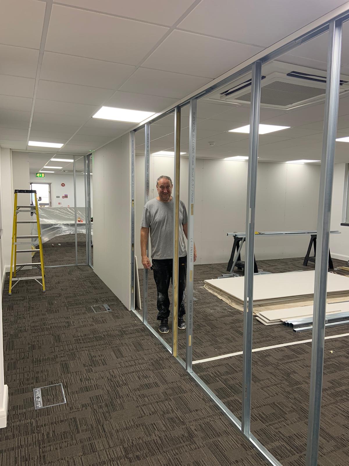On this project we installed a mix of solid and glass stud type partitioning to divide the large open plan office into 4 smaller office small business suites. The stud partitioning system offers great sound reduction properties and fire resistance within office space. The solid partitioning was decorated over with white contract vinyl wallcovering, aluminium trims to all plasterboard joints and a standard white laminated skirting. The construction detailing means the partitioning is full demountable, which was important for this Client to have the flexibility to alter the office suite sizes upon demand.