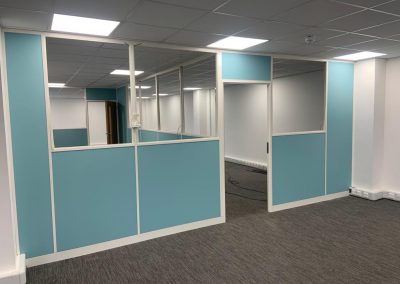 The solid modules are then decorated over with a wipeable wallpaper which is available in many different colours and styles. On this project, the Client chose a turquoise colour which works brilliantly with the white aluminium partition framing. A laminated white finished skirting board is then fitted to the partitioning to finish the system.